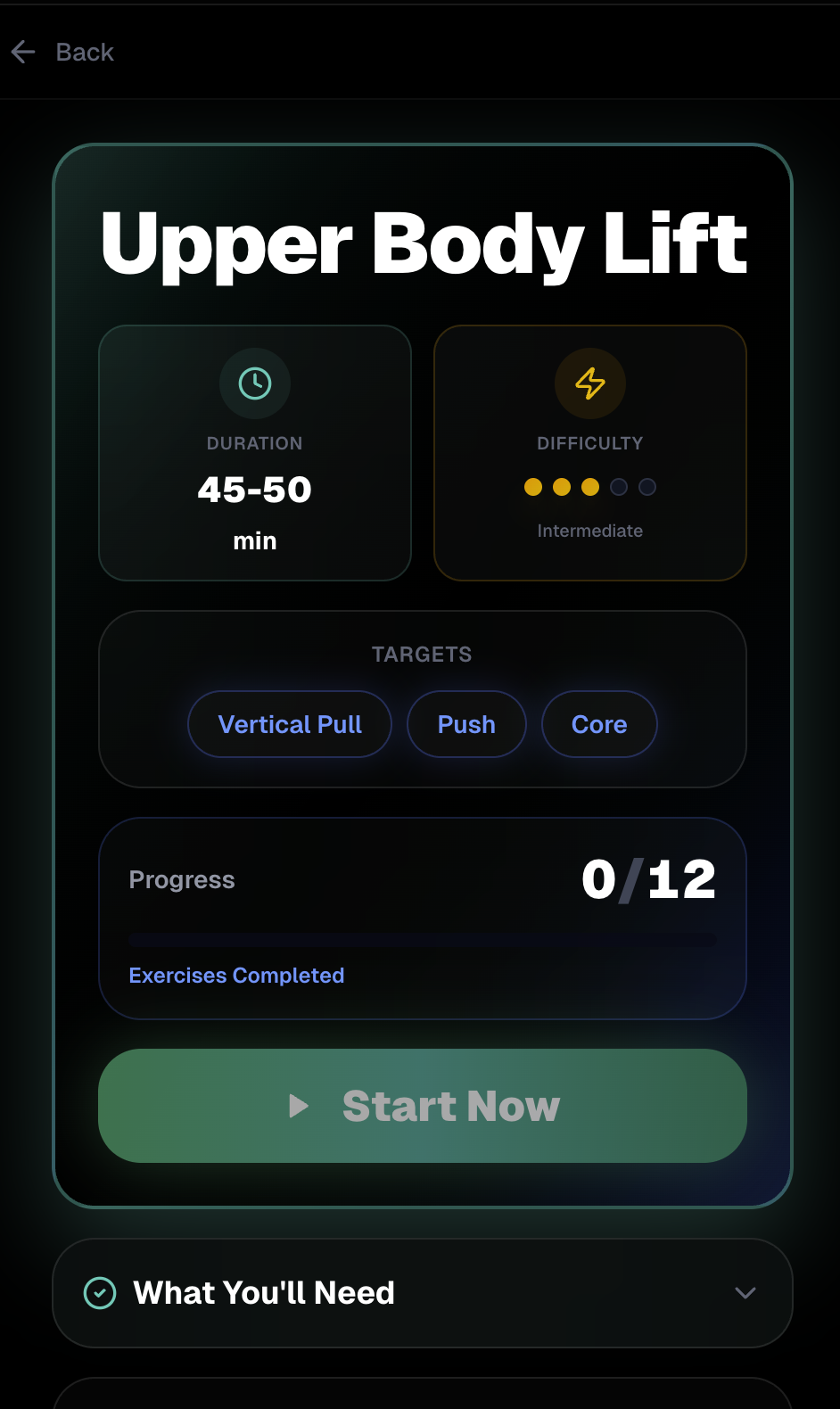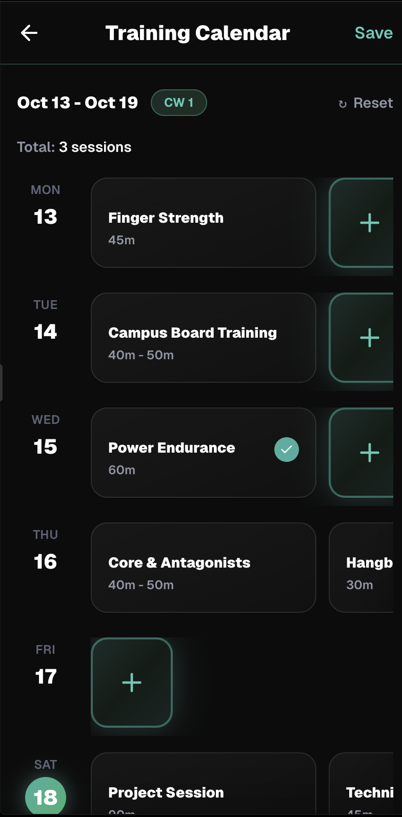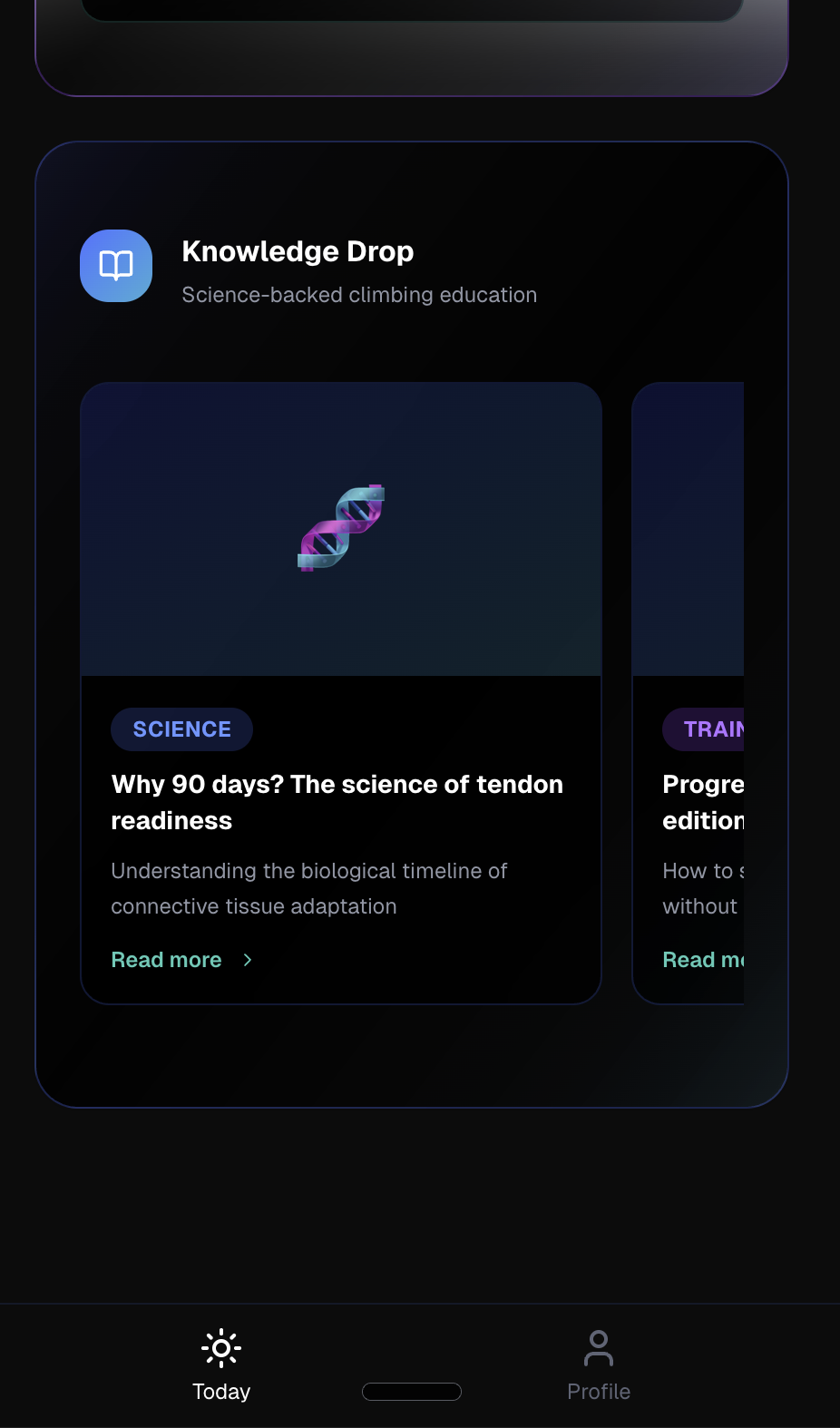 Precision-programmed sessions tailored to your level. The training engine applies movement pattern principles and load management — no coaching background required. Each session targets the right stimulus: pulling strength, finger load, or antagonist work, at the right time.