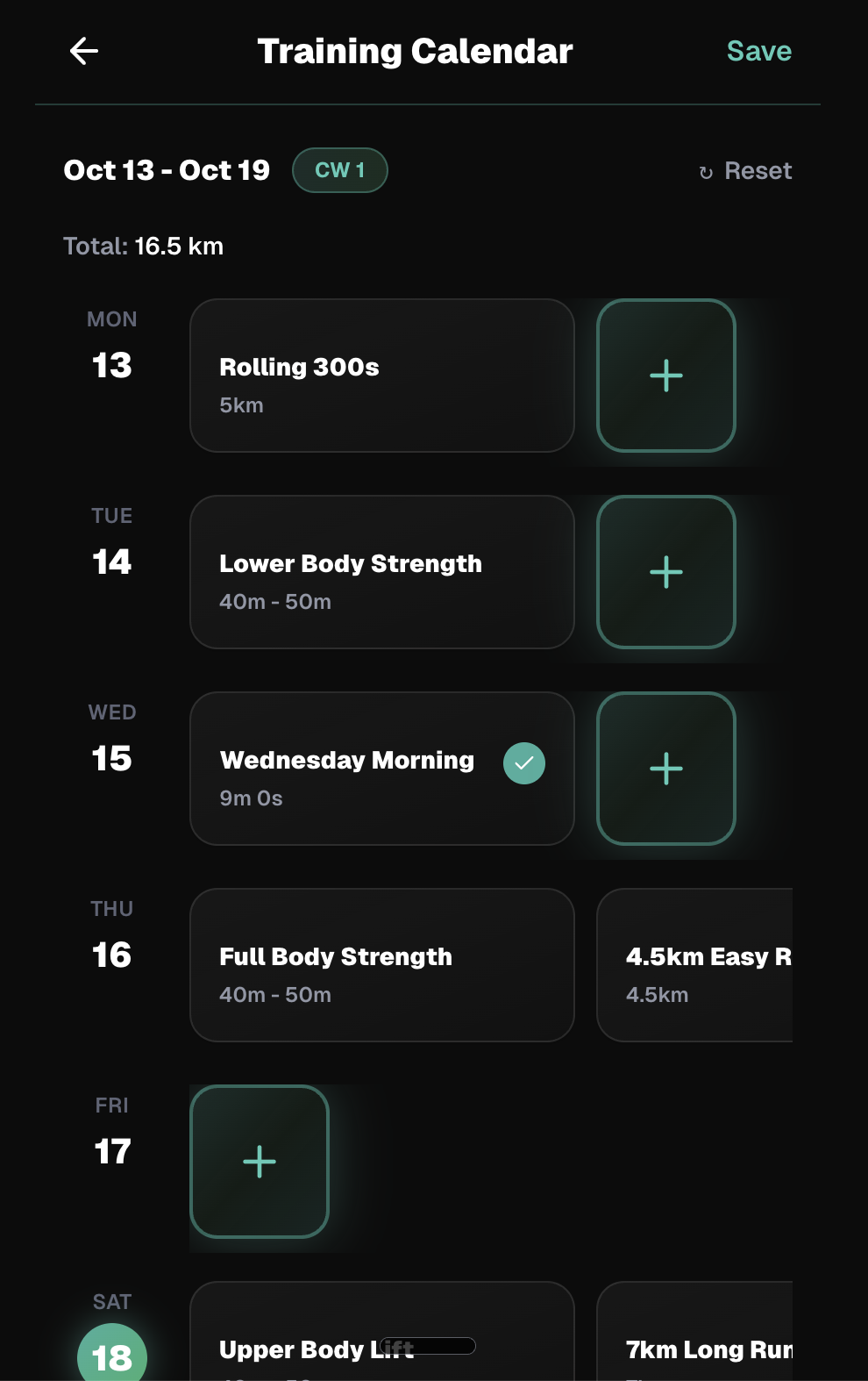 Full visibility over your training block. The scheduler maintains periodization integrity around your life — one tap to reschedule without losing structural coherence across the mesocycle.